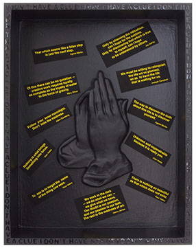 Inspiration, Please, Inspiration humorously explores the transcendent creative process. Praying hands symbolize respect for the ineffable creative experience or perhaps are an expression of desperation. Harvesting some of the inspirational quotes I keep around my studio, I used yellow text to play off Kandinsky’s characterization of yellow: “Yellow is the typically earthly colour...It may be paralleled in human nature, with madness, not with melancholy or hypochondriacal mania, but rather with violent raving lunacy.” Ah, yes, indeed, that good old ‘Artistic Raving Lunacy’—’Sheer Obsessive Creativity!’