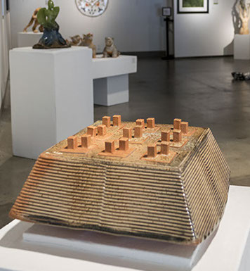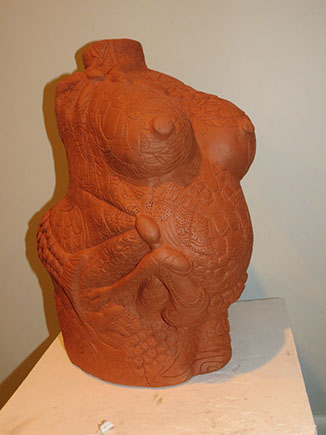 I let these slabs of combined clays guide me when executing my ideas, seeing where it will lead me. It feels like a partnership, a form of dialog between the media and my creative efforts. After bisque firing, I use solutions of soda ash to bring out the clays inherent colors and textures that give the ceramic sculptures their unique voice.