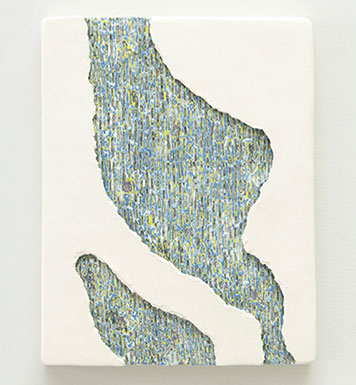 Glazes perform at a level that engages the viewer in an abstract skin generated through the glazing process. She juxtaposes color, texture, and drawing using a variety of materials to accomplish a painterly surface, including ceramic pencil, slip, oxide, or glaze creating a sublime effect, reflecting phenomenon found in nature. Color plays a significant role in the work.