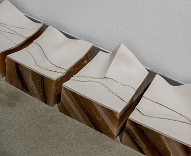 The sculptures are composed of porcelain slabs, supported on paraffin at different levels from the floor. The solid but fragile porcelain is supported by an unstable, slow moving column of layered paraffin; a sign of the accumulation of events and the passing of time. The gaps between the pieces represent earth fractures and man-made slices. The organic reliefs of porcelain slabs represent mountain ranges that reflect the influence that the natural world has had on me. In contrast, the geometric organization of the installations conveys the image of cityscapes and makes reference to the rational geometrical subdivision of the land.