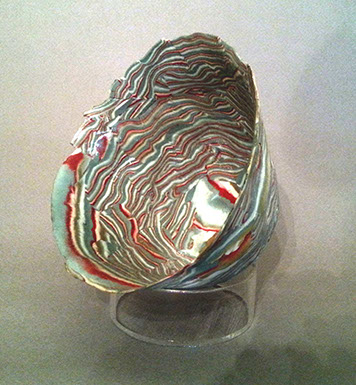 My current work, partially affected by my new interest in quilting, has a strong affinity to pattern; sometimes organized, sometimes free. Orderly patterns, symmetric configurations, or fractals with their never-ending repetitions intrigue me. Contrarily, I sometimes take the opposite tact –reveling in abstract imperfections and chaos itself. The latter is true of my Cracked Egg Shell series, executed with random colored clay lines and ragged edges.